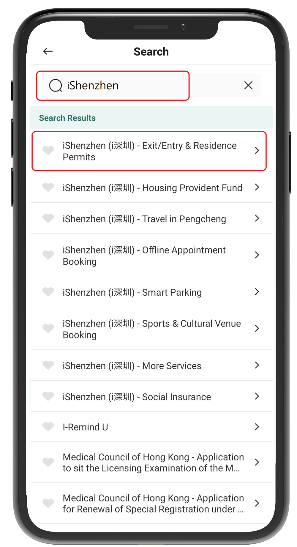 Input "iShenzhen" in the search area, and click the required online service to open the "iShenzhen" mobile app. The "iAM Smart" has connected to Exit/Entry & Residence Permits, Housing Provident Fund, Travel in Pengcheng, Offline Appointment Booking, Smart Parking, Sports & Cultural Venue Booking, Social Insurance and More Services of "iShenzhen".